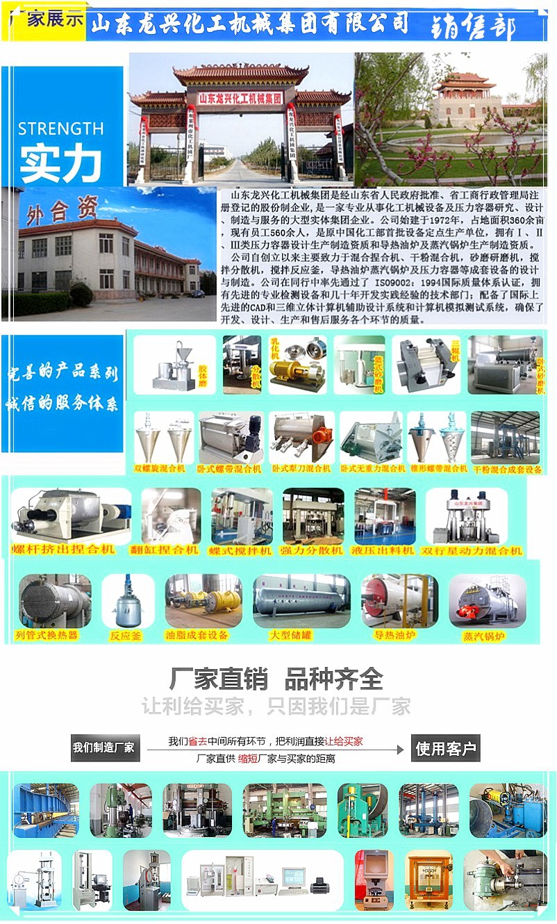山東龍興化工機械集團憑借在業內三十多年的技術積累和成長經歷,已經發展為集科研、開發、制造為一體的科技型集團公司,主要業務涉及液體研磨機、攪拌分散機,膏體混拌捏合機、雙行星動力攪拌混合機,干粉攪拌混合機,導熱油、蒸汽鍋爐、低溫容器及反應釜罐和換熱器及一二三類壓力容器的設計與生產。同時我們承接行業用戶成套設備及生產線的設計制造業務,龍興人愿與天下有識之士攜手共創新的輝煌。